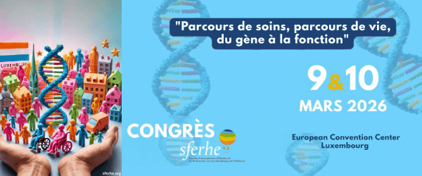 Société Francophone d’Etudes et de Recherche sur les Handicaps de l’Enfance Congrès 2026 – 9 & 10 mars 2026 European Convention Center Luxembourg « Parcours de soins, parcours de vie, du gène à la fonction » Inscriptions ouvertes et gratuites pour les familles Session familles, workshops, exposants et spectacle Plus d’informations : https://sferhe.org/